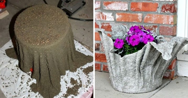 Не по -малко лесно да се направи саксия от текстил или стара кърпа. За да го създадете, ще ви е необходим контейнер за смесване, плат, кофа и опора. Тук всичко е изключително просто: тъканта се потапя в бетонен разтвор до пълното импрегниране, след това се закача на кофа, поставя се на подложка. Ако е необходимо, можете веднага да коригирате ръбовете на бъдещата саксия, като ги подрязвате или ги огъвате отстрани, като венчелистчета, когато разтворът започне да замръзва.