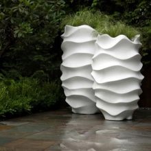 - бетонна вазова купа ще бъде декорация на градината: оригиналният модел, нанесен с помощта на шаблон, ще придаде уникалност на продукта и ще ви позволи да направите дизайна възможно най-професионален.