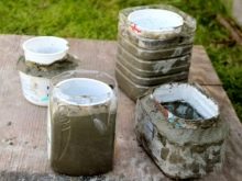 Този метод е най -простият. Използваните 5-литрови бутилки се нарязват на желаната височина, след което на дъното се излива бетон. Често вътре се вмъква кръгла форма, следвайки основната технология, запълвайки я с пясък в торба или чакъл. Някои саксии, когато се втвърдят, имат готов релефен модел под формата на напречни ивици, оставени под формата на по-голям капацитет. Други изглеждат оригинални, различаващи се по къдравата форма на ръба.
