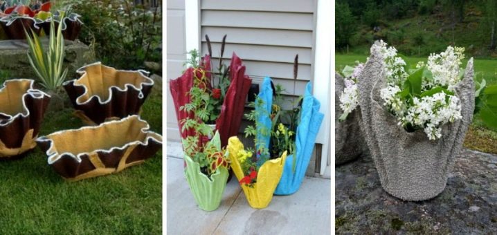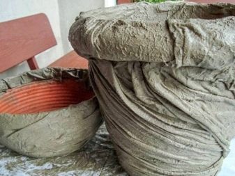 Не по -малко лесно да се направи саксия от текстил или стара кърпа. За да го създадете, ще ви е необходим контейнер за смесване, плат, кофа и опора. Тук всичко е изключително просто: тъканта се потапя в бетонен разтвор до пълното импрегниране, след това се закача на кофа, поставя се на подложка. Ако е необходимо, можете веднага да коригирате ръбовете на бъдещата саксия, като ги подрязвате или ги огъвате отстрани, като венчелистчета, когато разтворът започне да замръзва.