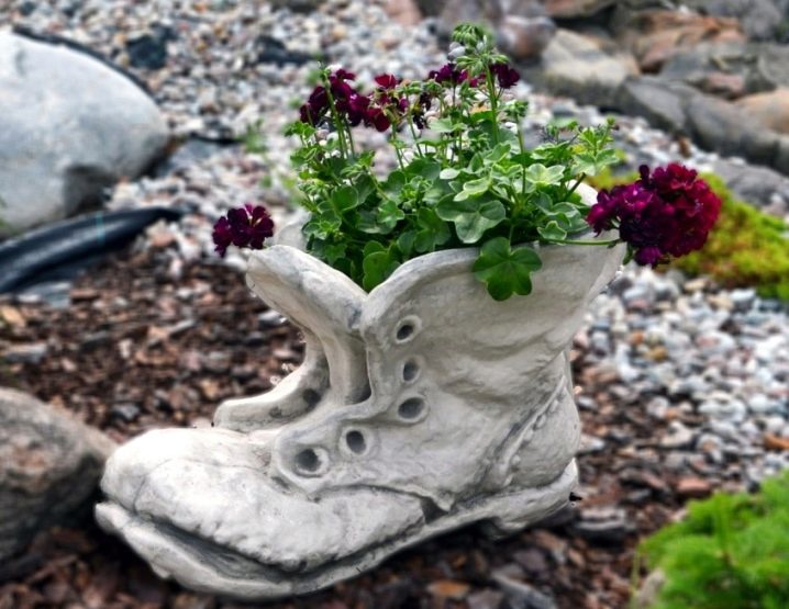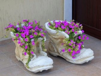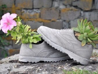 - необичайна саксия-обувка от стара обувка не се нуждае от допълнителен декор поради необичайната си форма и изобилието от малки детайли, тя е самодостатъчна и оригинална, чудесна за средно големи съцветия;