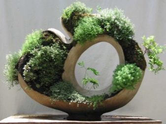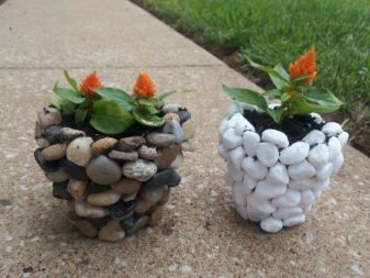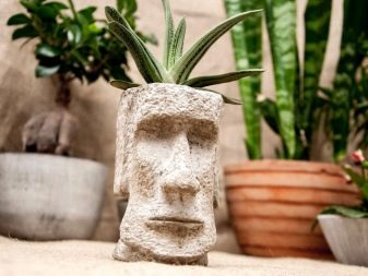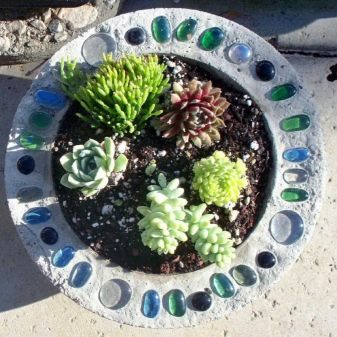Всеки избира довършването самостоятелно: просто трябва да украсите повърхността с камъчета с различни форми, оставяйки доминиращото място на декора на живи цветя. Други започнаха работа, за да демонстрират дизайнерски умения, като декорират повърхности с резби, като индиански теми. В същото време растенията в този тандем изглеждат не по -малко стилни..