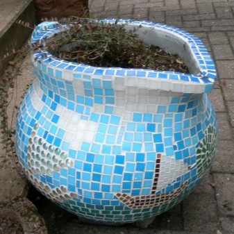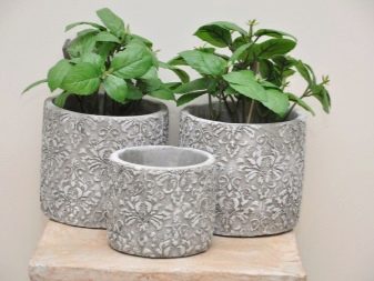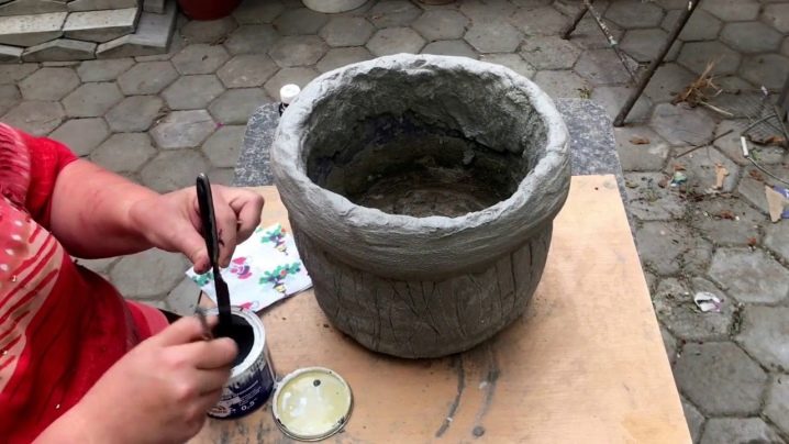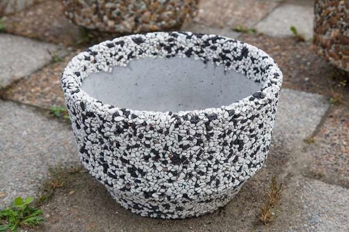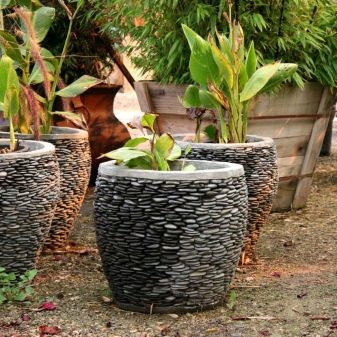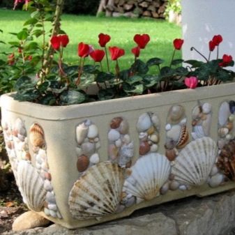 Такива продукти не са украсени с използване на лепило: под въздействието на дъжд, сняг и вятър декорът бързо ще се отдалечи от повърхността на саксията. Понякога, докато бетонът изсъхне, той се поръсва с пясък с хетерогенна структура отгоре, придавайки на повърхността грапавост и интересна текстура. След боядисване такава саксия ще изглежда стилно и необичайно. Често черупките са включени в дизайна, въпреки че трябва да бъдете изключително внимателни с този материал, в противен случай черупките могат да се напукат.