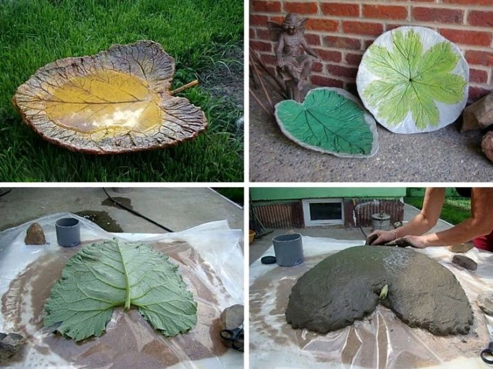Интересно довършително решение ще бъдат заготовките от бетонни листа, които да съответстват на основния продукт. Такъв декор може да се постави около саксията или да се изпълни пътека с него, да се украси алпинеума. Има много възможности: всичко зависи от вкусовите предпочитания и наличното свободно време за реализиране на идеята. Съставът може да включва камъни близо до саксията.