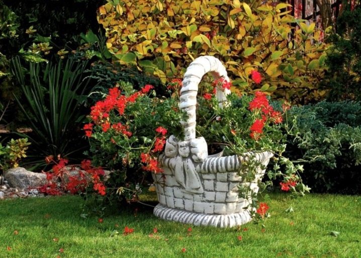 - дизайнът под формата на плетена кошница изглежда нежен и лек: тази саксия, рамката на която е самата кошница, импрегнирана с циментова композиция и боядисана с бяла боя, ще внесе атмосферата на древността в ландшафтния дизайн;