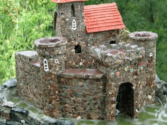 След това трябва да се поставят камъни върху всяка кула, като се използва циментова замазка като закрепващ материал. Прозорците на кулите трябва да бъдат изрязани от бутилките и циментирани. Покривите трябва да бъдат покрити със счупени керемиди. Ако “заградите” такъв замък със стена от камъни, направите арка за портата, получавате завършена композиция. Оцветяването на камъни е дейност, която дори децата могат да овладеят. Използвайки бои, устойчиви на влага, боядисвайте подходящи калдъръмени камъни, разстелете различни форми от тях върху цветни лехи или тревни площи.