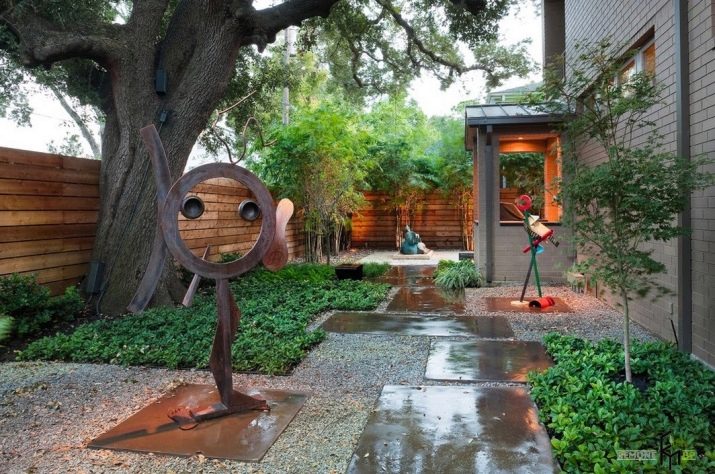 - Художествена скулптура на лятната градина. Може да има неопределени абстрактни форми, екстравагантен вид. За създаването на такива елементи те използват предимно метал, пластмаса, цимент, гипс и дори полиуретанова пяна..