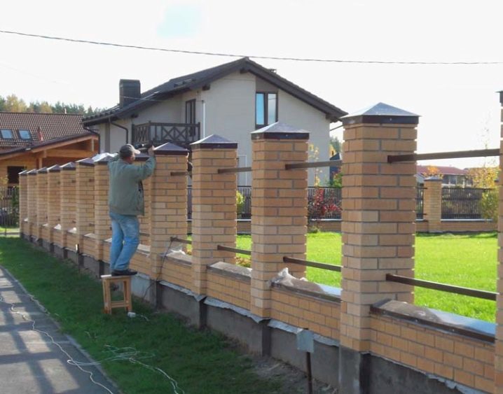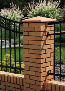 По време на строителния процес стълбовете са защитени с плътен пластмасов филм, като обвиват горната част и фиксират филма с въже. След като тухлените опори са поставени, могат да се монтират защитни плотове. Това е прост процес, цялата работа може да се извърши на ръка. Ако аспираторите се планират да бъдат оборудвани с осветителни тела, тогава е необходимо да се доведе изолирано окабеляване към всеки полюс. За клинкерни тапи ще трябва да смесите цименто-пясъчен разтвор, а за керамични тапи-лепило за плочки за работа на открито.