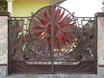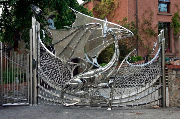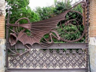 - Ако целта за придобиване на ковани порти е не само надеждността, но и желанието да се обърне внимание на фоайето на входа и какво се крие зад него, тогава най -доброто решение би било закупуването на ярки продукти с необичаен дизайн..