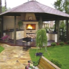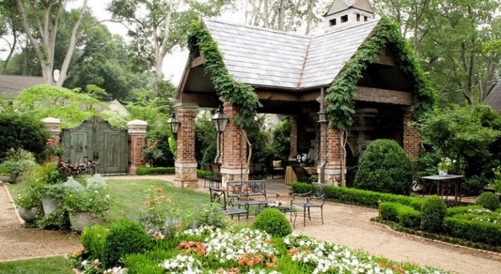 Вторият вариант е по -просторен двор, декориран в английски стил. Към къщата е прикрепена беседка с каменни колони, поддържащи покрива, и зелени растения, изкачващи се по краищата. Трапезарията се намира под тази тента. Друга маса със столове е инсталирана в центъра на двора, което означава, че много гости могат да бъдат приети тук наведнъж. На сайта има много зеленина, което го прави наистина живописен.