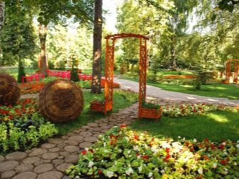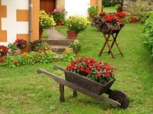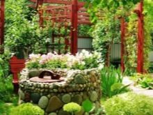 Рустик стил е много прост. Територията може да бъде оградена с ниска ограда, изтъкана от лоза със собствените си ръце, а пътеките са павирани с дървени стърготини. Често за декорация на градината се използват ненужни неща: стари кофи, глинени съдове със счупени дръжки, напукани бъчви или дървени вани. Всичко това може да се използва като независима градинска декорация или като алтернатива на саксии и цветни лехи. Напълнете стара кофа, бъчва или количка със земя, засадете там зеленина и цветя и смело инсталирайте във всяка област на вашия сайт.