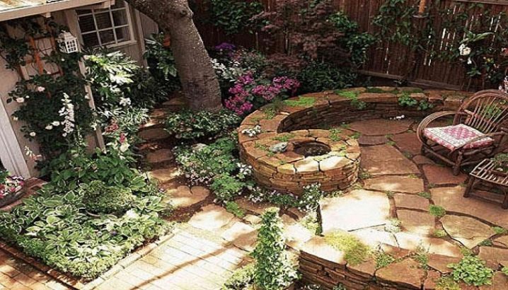 Първият пример е двор в приказен стил. Този мъничък парцел, разделен преди това на четвъртинки, побира цветна леха, градина и зона за отдих. Основните материали са камък и дърво, а живи растения се използват като декорация. Следователно съществува истинско единство с природата. Дизайнерите използваха заглушени цветове – тъмни нюанси на зелено, кафяво и бежово. И само ярки цветя се открояват на този фон. Такъв двор е мечтата на много начинаещи писатели и любители на приказките..