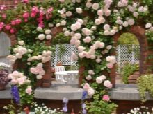 - Тъкане на рози. Те се считат за истински класици на ландшафтен дизайн. Техният изобилен цъфтеж и шикозен аромат създават благоприятна атмосфера на мястото за отдих и мечти. Цветята са малки, така че цялата композиция изглежда много елегантна и аристократична..