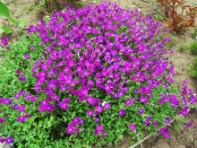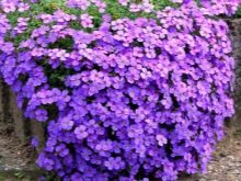 - Aubretia. Растение с много малки цветя с бял, син, лилав или друг нюанс. Височината на храстите е 10-13 см, а процесът на цъфтеж продължава до 45 дни.