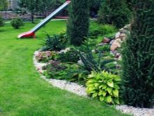 Можете да маркирате всяка зона, като използвате разделители под формата на писти, дялове и опори. След като подредите определени места за отдих и активно забавление, можете веднага да започнете да ги ограничавате със зелени площи под формата на цъфтящи цветни лехи, градини и зелени тревни площи. Зонирането на сайта ще създаде уникален контур около него, а също така ефективно ще подчертае всички предимства, скривайки очевидни недостатъци.