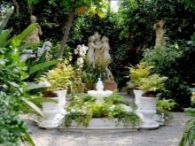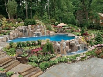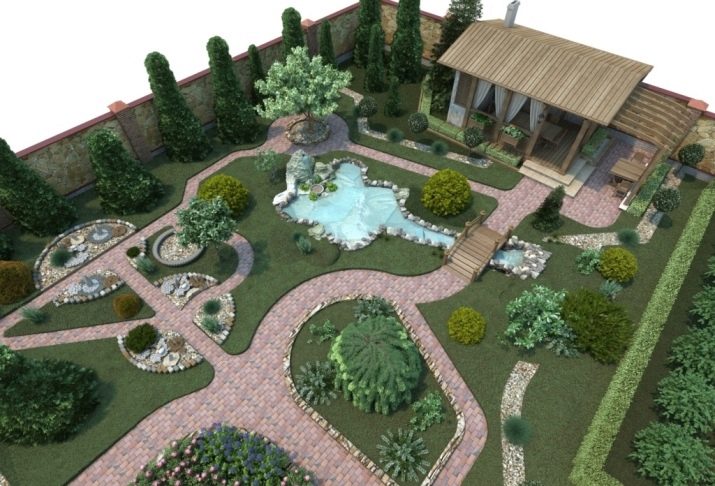 - Ръчно изработени декоративни елементи, като езера с фонтани, алпийски каменни пързалки, скулптури, цели инсталации под формата на къщи, мостове и всичко, за което въображението може да се сети. Подобни декорации могат да превърнат вилата в тематичен парк от определена епоха или страна и радост за децата..