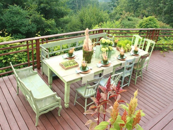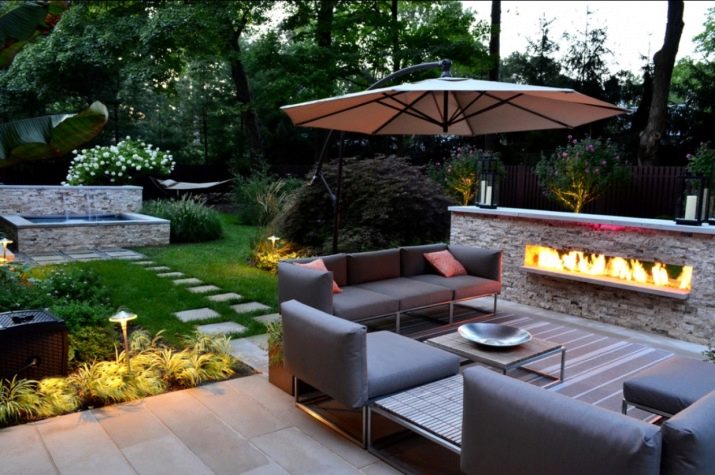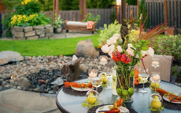 Декорирането на готови предмети и цветни лехи с малки интериорни елементи е не по-малко важно от етапа на изработване на скица. Свещи, одеяла, градински мебели, флюгер на покрива на беседката, дървен материал близо до огнището – всичко това придава уникална атмосфера на уют и топлина.