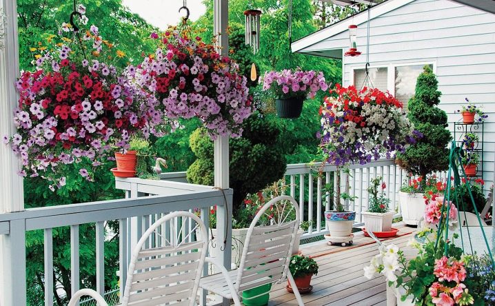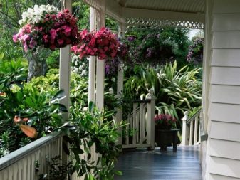 Цветята могат да се използват за украса на къщата както отвън, така и отвътре, на верандата. Ако тези цветя са в същите вани като на улицата, дизайнът ще се сгъне в едно цяло..