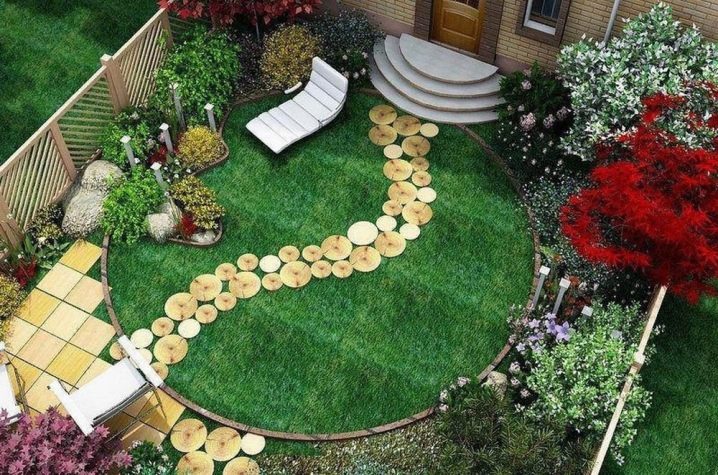 Самият случай, когато успешен ландшафтен дизайн е ясно видим дори отгоре. Криволичеща пътека, изработена от дървени разфасовки с различни размери, визуално увеличава пространството от вратите до зоната за отдих. Бежовите облицовъчни плочки в близост до столовете са в хармоничен тон с леко изрязване на пистата.