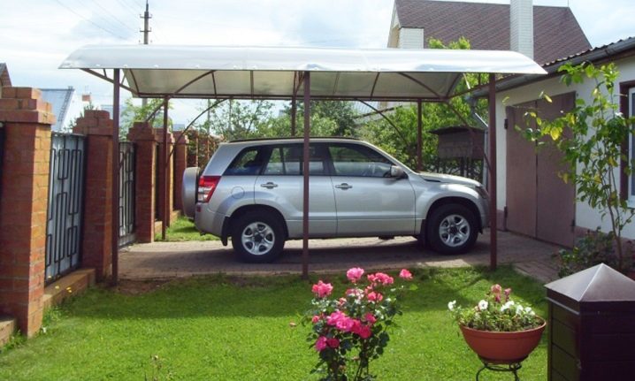 Най -сигурният и екологичен вариант е да се създаде покрита зона за паркиране. Ако площта на сайта или финансите не позволяват такъв лукс, тогава можете да изградите поне навес, изработен от устойчива прозрачна пластмаса, и фурнирни стълбове в съответствие с основната сграда – тухла, дърво и всякакъв друг материал.