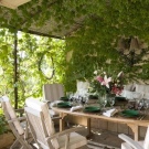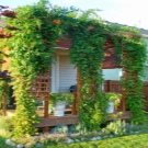 Основният начин за създаване на уникална атмосфера на старо имение е така нареченото вертикално градинарство. С помощта на катерещи растения като грозде, сладък грах, хмел или най -популярния от тях, клематис, можете да донесете красота и да създадете подобие на стена или покрив близо до беседката и да се скриете от топлината. Можете да украсите с такъв венец както веранда, така и отворена беседка-пергола.