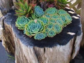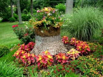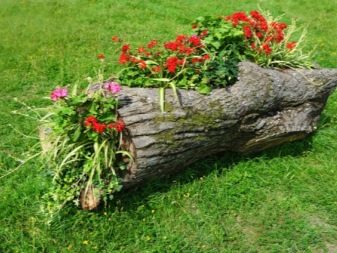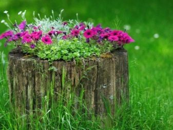 Не бързайте да премахнете стария изсечен багажник от вилата. Тя може да бъде чудесна цветна леха. Изрежете изгнилата сърцевина, напълнете я със пръст и засадете три вида цветя: жълто, червено, синьо. Красотата! Цветовите опции могат да бъдат каквито искате. Или може би искате да създадете композиция от розови и бели цветя. Такова цветно легло ще изглежда нежно и романтично..