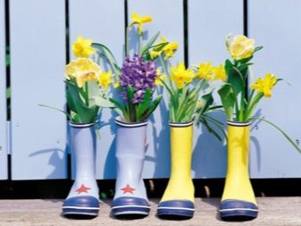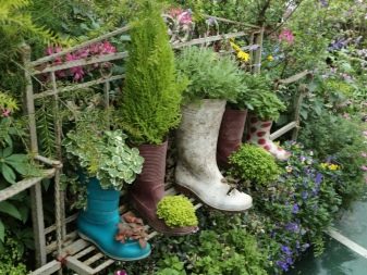 Мислили ли сте някога, че в стари гумени ботуши можете да оборудвате две малки цветни лехи с ярки цветове. Изглежда интересно. Точно като стар чайник с чаши, които могат да държат малки цветя.