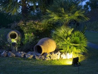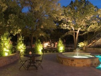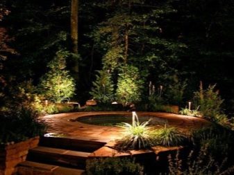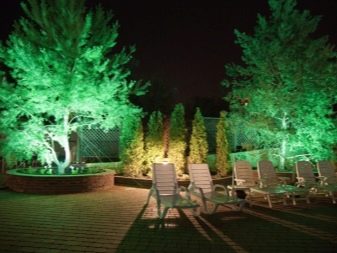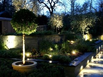 Пътеките, където растат декоративни дървета – борове, туи, хвойни, могат да бъдат украсени с вградени лампи. Произвеждат се специални постове, които излъчват светлина, която също ще бъде добра украса за вашата градина вечер..