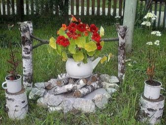 Можете да построите много красиво огнище на поляна. За да направим това, вземаме два малки ствола, изрязваме горната част под формата на прашка и фиксираме пръчка върху тях, върху която е закачен обикновен чайник. В него засаждате зеленина и малки цветя, а около него, вече на земята, поставяте яркочервени цветя, около които е положен камък. Ето един оригинален красив кът, готов за вас..