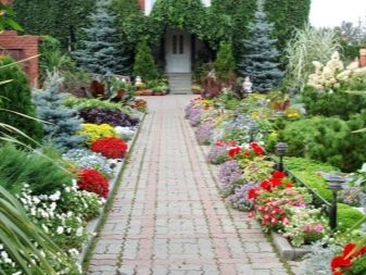 Градинските пътеки също са важен компонент на дизайна. Те могат да бъдат направени от голямо разнообразие от материали: чакъл, павета, естествен камък, бетонни плочки, тухлена настилка, декоративни плочки, камъчета. По пътеките можете да направите граници под формата на цветя, да засадите декоративни дървета. Бор, смърч, туя ще облагородят вашия сайт.