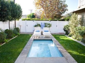 Когато избирате обикновен стил, басейнът трябва да отговаря на строги геометрични форми и да има правоъгълна форма. Пейзажният стил предполага, че са подходящи нещо по -леко, ефирно и спокойно, използвайки естествени материали.