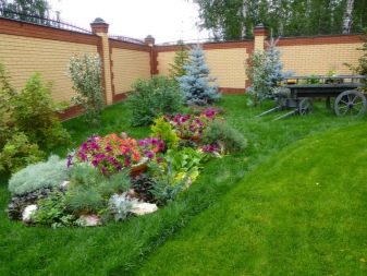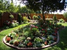Можете да поставите беседка за пиене на чай в един от далечните ъгли. И след това експериментирайте с цветни лехи. Центърът на композицията ще бъде скулптура по ваш избор. И около вас ще подредите цветни лехи с различни размери. Единият например е облицован с камъни под формата на цвете, другият представлява овал, третият – кръг. В този случай използваме само гладки форми. Засаждаме цветя, така че във всяко цветно легло да има не повече от два или три вида.