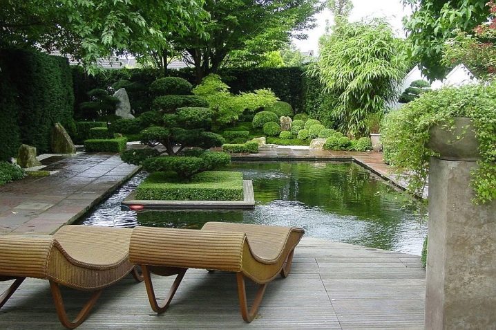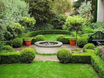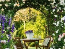 Готови арки с къдрави цветя, грациозни пейки, градински столове, езерце, украсено с ограда от камъни, ще се впишат добре в строгия дизайн на градината.