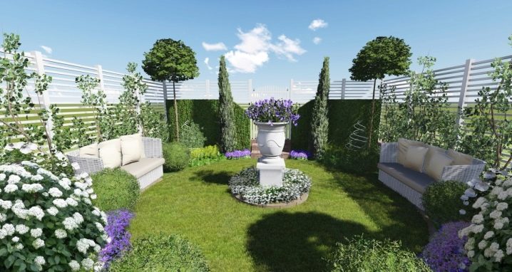 За да не изглежда още по -малка малка площ, когато работите с нейния дизайн, е важно да не я пренаситете с декоративни елементи. Освен това трябва оптимално да изберете размера на обектите, инсталирани в градината, и височината на растенията..