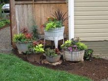 За малка площ са подходящи саксийни растения, подредени в многоетажни структури. Те могат да бъдат преместени или премахнати от градината, ако е необходимо. Най -добре е да поставите саксийни композиции близо до пътеки, беседки или на входа на къщата.. Саксията трябва да съответства на височината на растението и особеностите на развитието на кореновата му система.. Джуджетата, иглолистните рози и зеленчуците (чушки, домати) растат добре в саксии..