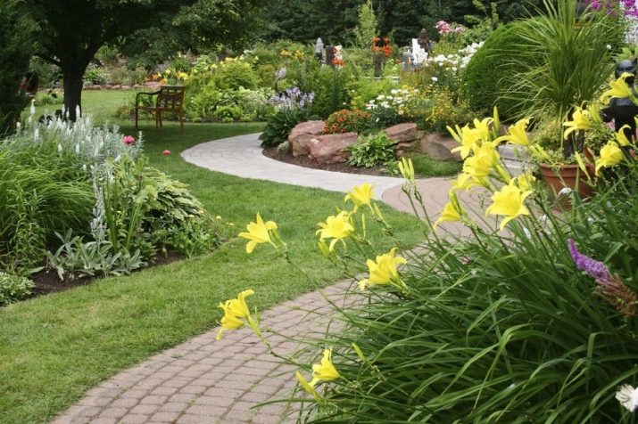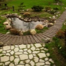 - Писти – на строителния пазар има доста материали за тяхното производство, изборът зависи от стила и въображението на дизайнера. В допълнение към обичайните плочки, камък, черупки, можете да използвате разфасовки и други естествени материали. В големите градини правите, симетрични пътеки изглеждат добре. В малките участъци пътеките трябва да се вият между дървета и цветни лехи, да изчезват в храстите, позволявайки на въображението да си представи, че зад храстите има голяма градина.