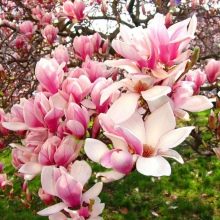- Магнолия. По време на цъфтежа това дърво може да се възхищава с часове. Само на него можете да видите нежни розови цветя, с размерите на детска топка..