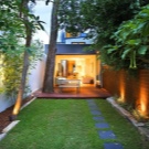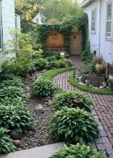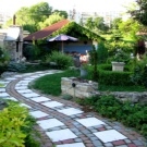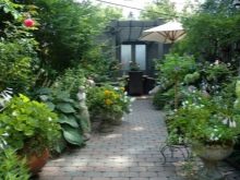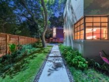 Такова разделяне не предполага връзка между двете части на вътрешния двор именно през къщата. Тук трябва да се вземат предвид съображенията за сигурност. За да се съобразите с тях, препоръчително е да организирате втори изход от него в задната част на територията. Отстрани на къщата, ако не е непрекъсната сграда, трябва да се оставят проходи, така че да не се прилепва директно към оградата. С това оформление те ще бъдат стеснени и удължени. За техния дизайн са подходящи същите перголи и декоративни лампи..