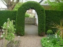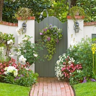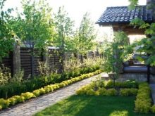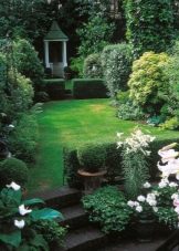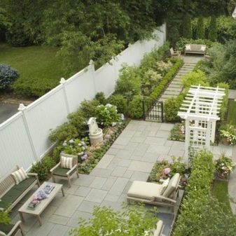 Далечната част на градината е подходяща за подреждане на арка и пейка за отдих.. Те трябва да бъдат направени в същия стил.. За да украсите оградата от единия край на територията, е по -добре да използвате дървета с храсти, засадени върху нея. Използването на тази техника визуално съкращава дължината на сечението..