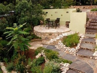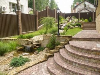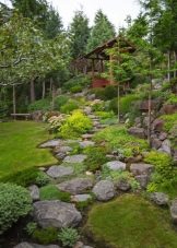 Ако такъв парцел с къща се намира на склона на някакъв хълм, тогава това обстоятелство трябва да се превърне в друга причина за дизайнерското въображение на неговите собственици. В най -ниската и удушена част от нея, където трябва да се събира дъждовна вода, могат да се засаждат гъби. Живописна поляна с вкусни гъби по нея ще бъде великолепна украса на територията. Дърветата, както в предишния случай, трябва да бъдат засадени от едната страна на площадката, като се има предвид визуалното разширяване на нейните граници.