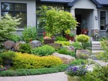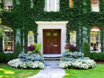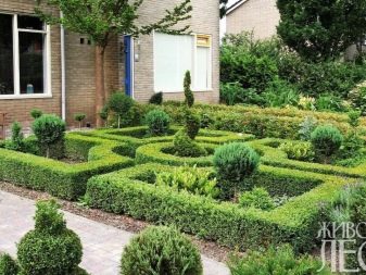 Предната част, разположена пред къщата, трябва да бъде отворена пред улицата. За да направите това, е подходящо да използвате композиции, съставени от подрязани храсти, или можете да се ограничите до един голям храст..