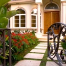Препоръчително е да се организира входната зона в предната част на територията с изместване към една от страничните граници. Ако искате да запазите симетрия, можете да постигнете желания ефект, като поставите растения върху свободната част на сайта. В центъра трябва да поставите права пътека до входа с граници и цветя отстрани. Трябва да се остави място пред къщата по цялата й фасада. Обектът е свързан със зоната за паркиране и страничните пътеки.