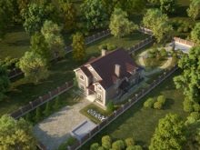 С централното разположение на къщата на относително дълъг парцел, дневната с шезлонги, барбекю и трапезария е ясно отделена от помощната зона. Всичко това пасва идеално от двете страни на къщата. Такова разделяне на сайта изглежда като почти квадратни зони и поставянето на всички тези обекти върху тях е значително опростено..