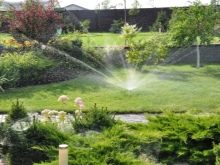 Също така, за голям градински парцел могат да бъдат подходящи всички видове напоителни системи (устройства за напояване на тревни площи, големи механизми за поливане на градини). Такива конструкции значително ще улеснят работата на собствениците върху техния парцел и ще им позволят значително да спестят време, поради което на териториите на значителна площ е важно да се поставят не само декоративни водни механизми, но и системи за овлажняване на градината себе си.