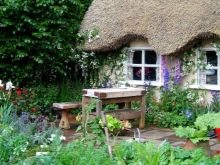 Парцелът, проектиран в тази посока, няма да изисква големи инвестиции и сложна поддръжка. Когато създавате дизайн в селски стил, важно е да запомните, че пътеките, лампите и много други неразделни елементи от градината трябва да бъдат леко разпръснати, небрежни. Също така, този тип ландшафтен дизайн се характеризира с наличието на няколко големи цветни лехи, една от които е основната.