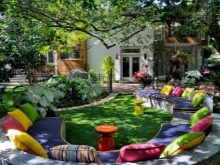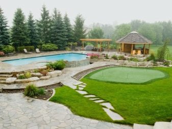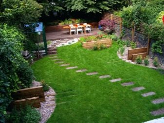 Някои проекти на дизайнери предлагат местоположението на отделна голяма зона за отдих в градинския парцел, където всички близки могат да се съберат. Това пространство може да бъде заобиколено от „колан“ от камъни с различни размери. Пътеката, водеща до тази част от територията, може да бъде положена с плоски камъни. Мебелите могат да бъдат представени от няколко малки маси, определен брой фотьойли или дивани.