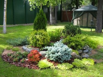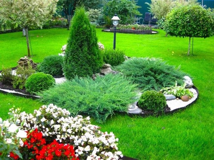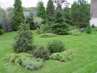 Изпитаните във времето готови дизайнерски решения ще бъдат добра помощ за начинаещи. Така например тревата, която се извива като река, ще изглежда като печеливша, чиито „брегове“ са композиции от различни видове смърч и хвойна. Високите иглолистни дървета на заден план ще изглеждат полезни в такава композиция..
