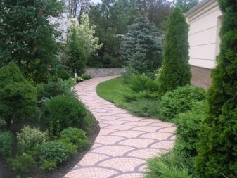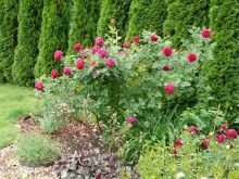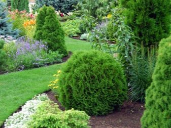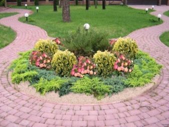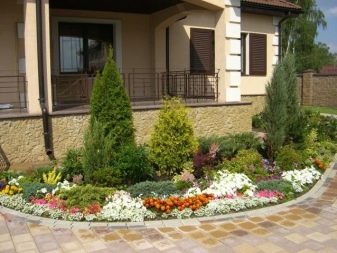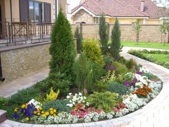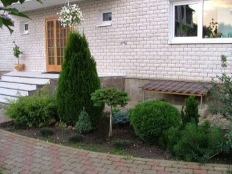 Живият плет от високи пирамидални туи изглежда величествен и строг. Грациозен контраст в такава композиция ще бъдат ярки розови цветя, кокетно покрити с миксбордер от храстова хвойна. Просто и стилно решение би било да засадите малка кръгла цветна леха, която да изглежда празнично и красиво чрез комбиниране на различни сортове и цветове на иглолистни дървета.