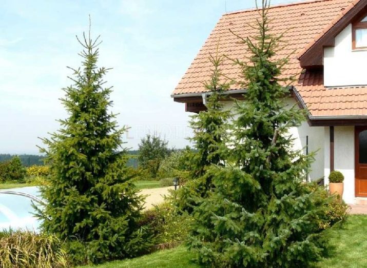 Това дърво е широко разпространено в средната лента и също е доста придирчиво към условията на отглеждане. В ландшафтния дизайн се използват както обикновена смърч, така и многобройните му сортови сортове. Най -известният е синият смърч, който поради необичайния цвят на иглите винаги изглежда красив и тържествен. Висок смърч Hoopsie, достигащ височина до 15 м, или пухкаво сръбско коледно дърво също ще бъде добър избор за мащабна композиция..