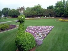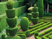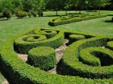 Тревата, украсена с фигурално подрязани декоративни храсти, изглежда грандиозно. В идеалния случай за това се използва вечнозелен чемшир. Неговата малка листа покрива добре поддържа формата си по време на къдрава прическа, позволявайки да се получат интересни декоративни елементи – от прости панделки до сложни сюжетни композиции. Но чемшировите храсти са топлолюбиви и не се вкореняват в северните райони..